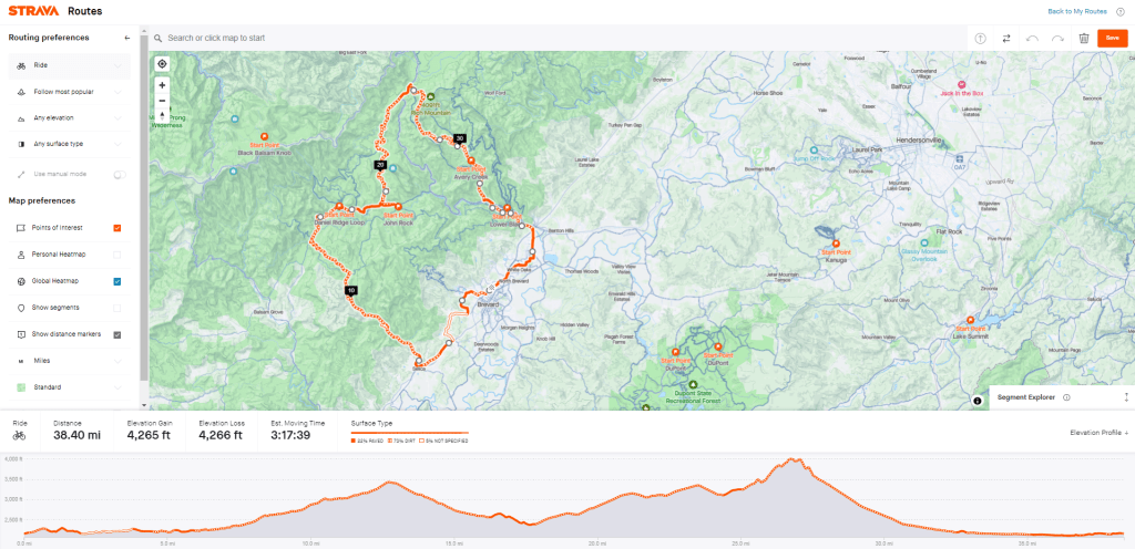 We all have favorite routes, this is mine. This route will take you on the best maintained gravel roads in this part of the forest and really bring out the strengths of your gravel bike. To start, you’ll ride south out of town towards Rosman. The strava route link below goes through Cashiers Valley, which is a great bike friendly road paralleling the highway. Unfortunately, we do have to hop on the highway for a half mile, but it is two lanes and a shoulder opens up halfway through. This is the only section where you’ll consistently interact with cars. After the highway we’ll hop on Selica Rd which will turn in to Cathey’s Creek Road. At the 6 mile mark, you’ll be done with pavement for a while. Cathey’s creek is one of the more underutilized roads in the forest, but still well maintained. If you’re feeling good this is a great climb to test the legs out. Will be around 30 minutes of moderate climbing with the KOM around 26 minutes. Just on the other side of the top of this climb is Glouchester Gap. Here you’ll have a big intersection with all sorts of add on options. We’ll go into those on different routes! Go right through a gate and start descending down towards the Davidson. This road has been closed since Hurricane Fred in 2021, so it hasn’t seen as much maintenance or traffic as you would like. Expect loose gravel and take your time. Some great sights along the way. Continue to descend down the Davidson until it turns to pavement. As soon as this happens, a single track trail – Davidson River Trail – will pop up on your right. Take that to get a little easy singletrack as you descend the river valley. Keep in mind, this trail sees heavy usage during busy times. If you’re seeing a lot of forest users, might make sense to just continue on the paved road down they will reconnect. At the end of the Davidson River trail, you’ll turn right back on to the road for a quarter mile before turning left on to 475B (aka headwaters). 475B is one of the more popular access roads in the forest. Expect some cars and lots of bikes. A few small waterfalls and viewpoints will present themselves as you climb. Viewpoints are best in the winter when the leaves are down, but you can sneak in some views through the foliage too! This rolling climb is another great one for some efforts to test the legs, or just enjoy the scenery. After the top, you’ll descend to the highway (276) and head up the highway for a half mile before turning right on to FR 477. Last gravel climb of the day, should take around 10-15 minutes so empty the tank! After the climb you’ll descend Avery Creek Road. You will see many peculiar looking bikes with very fat tires and springs on them climbing this road to access all of the world class mountain biking this road accesses. When this road ends, you’ll turn left onto 276 paved road and ride back in to town via the bike path. There is a cheeky short cut through the campground that I’ve included in the strava file. This really cuts down on the number of car interactions and makes for a nice cooldown back into town.